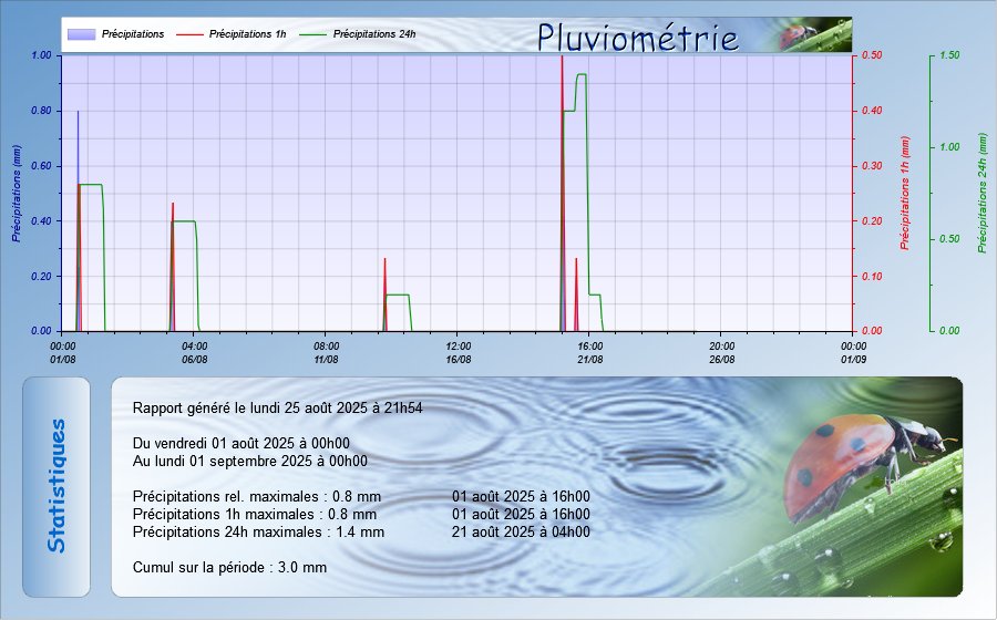 Attention, les données météo publiées sur ce site sont issues d'une station météo personnelle et sont données qu'à titre indicatif, elles ne peuvent en aucun cas être utilisées pour garantir la protection des personnes ou de biens quelconques.