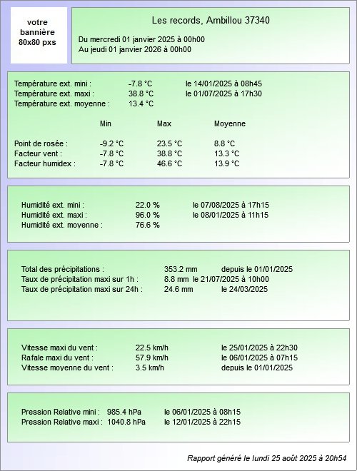 Attention, les données météo publiées sur ce site sont issues d'une station météo personnelle et sont données qu'à titre indicatif, elles ne peuvent en aucun cas être utilisées pour garantir la protection des personnes ou de biens quelconques.