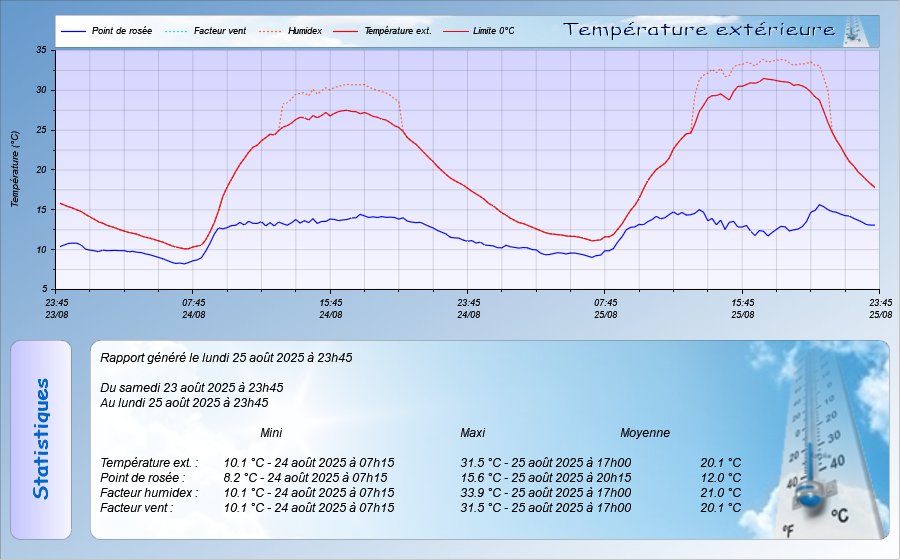 Attention, les données météo publiées sur ce site sont issues d'une station météo personnelle et sont données qu'à titre indicatif, elles ne peuvent en aucun cas être utilisées pour garantir la protection des personnes ou de biens quelconques.